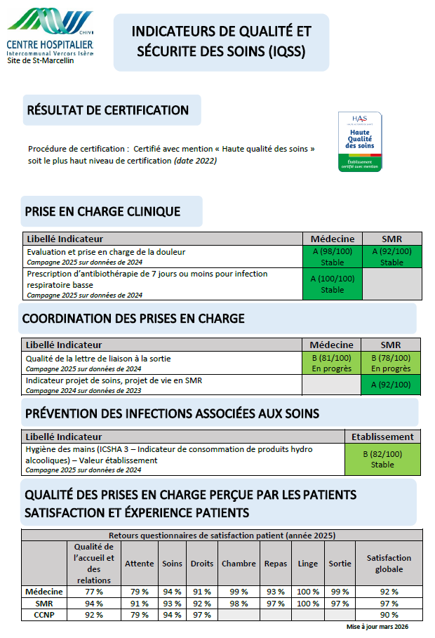 La dernière visite de certification HAS s’est déroulée au Centre Hospitaliser de St-Marcellin en Avril 2022. La HAS a prononcé la certification de l’établissement avec mention « Haute Qualité des Soins » soit le plus haut niveau pouvant être obtenu.